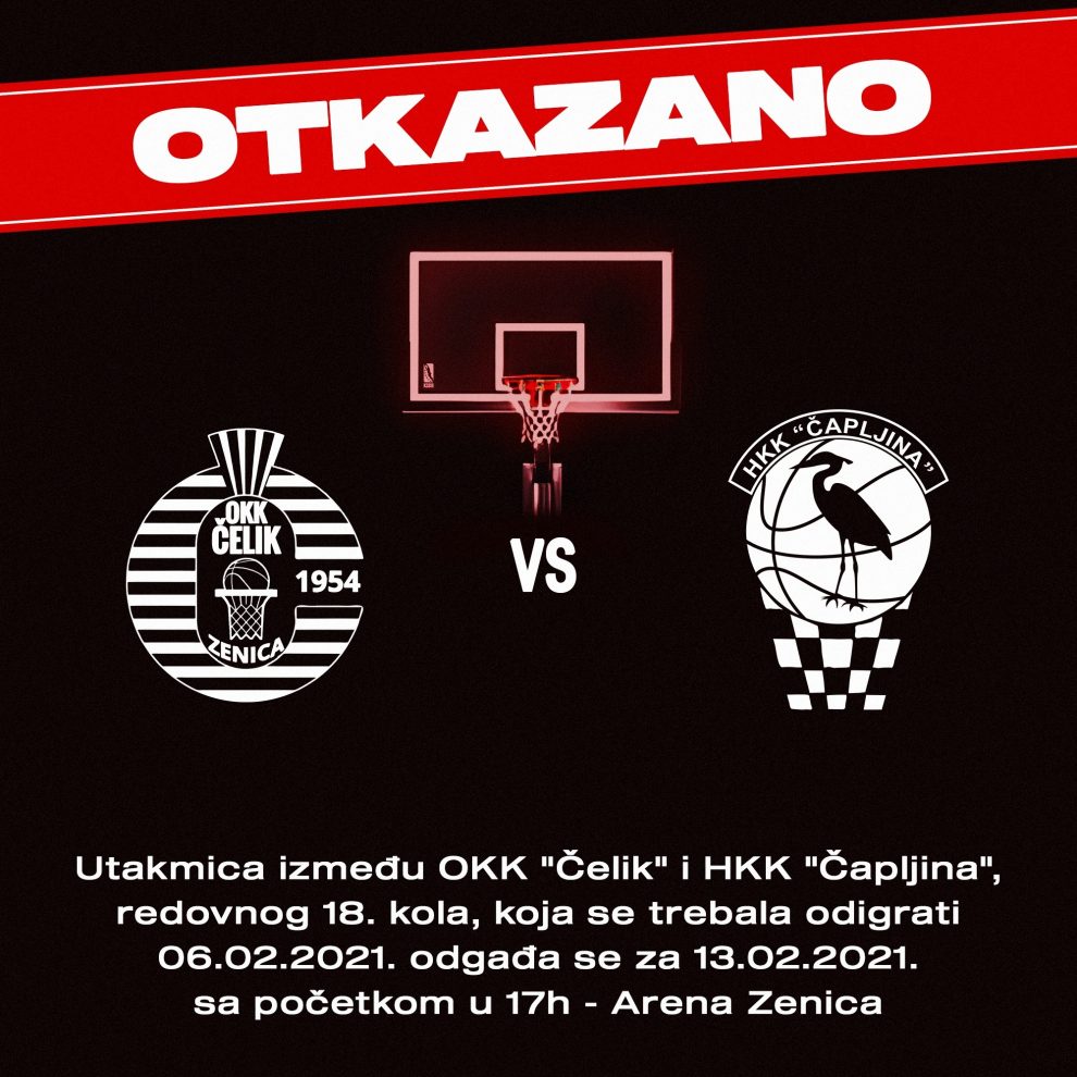 Utakmica OKK Čelik – HKK Čapljina je odgođena za subotu 13.2.2021.godine u 17 sati u gradskoj Areni „Husejin Smajlović“ Zenica, zbog epidemiološke situacije u HKK Čapljina. Jesenas u Čapljini domaći su pobjedili Čelik sa 80:75. OKK Čelik je u nizu od četiri prvenstvene pobjede.