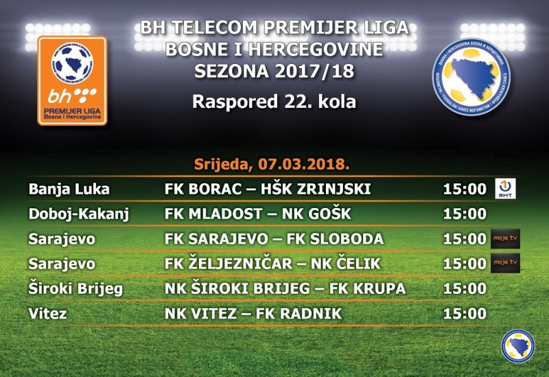 Najava 22. kola BHT Premijer lige BiH – Čelik u srijedu gostuje kod Željezničara u 15 sati – Ove srijede igraju se utakmice 22.kola BH Telekom Premijer nogometne lige BiH (11.kolo drugog dijela prvenstva i ujedno četvrto kolo proljetnog dijela prvenstva). Sve utakmice na rasporedu su u srijedu u 15 sati. Tri utakmice će biti u direktnom TV prijenosu: Željezničar – Čelik i Sarajevo – Sloboda (Moja TV), te Borac – Zrinjski (BHT1).