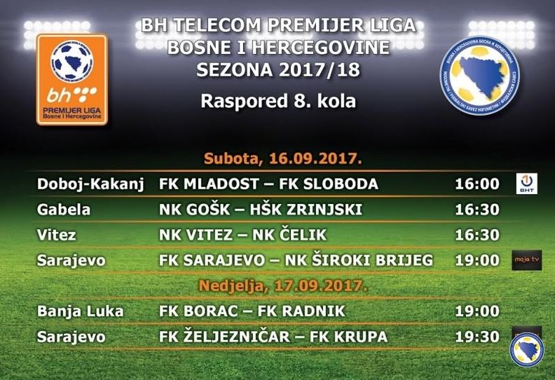 Donosimo kompletan raspored utakmica 8.kola (16./17.9. 2017.god.), parovi – satnica, TV: