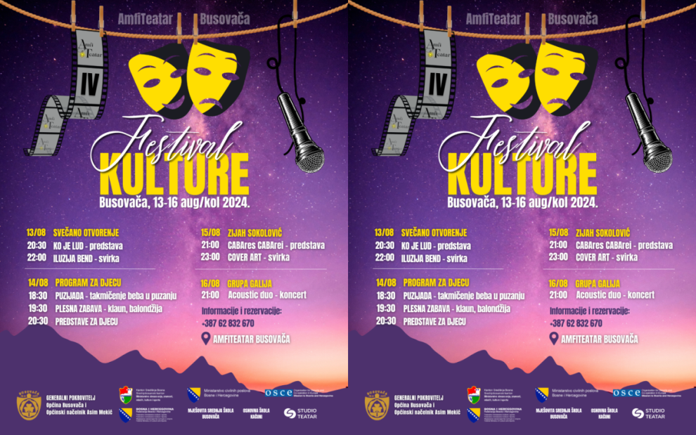 Četvrti međunarodni Festival kulture u organizaciji AmfiTeatra Busovača, ove godine će trajati od 13. do 16. augusta, a sve aktivnosti će se realizovati u amfiteatru na otvorenom u Busovači. Samo otvorenje Festivala kulture je planirano svečanom ceremonijom otvaranja, nakon koje će publika uživati u jednoj od najgledanijih predstava u prošloj godini, hit komediji „Ko je lud“ u režiji Mirze Begovića, a u kojoj igraju Zlatan Školjić i Adem Smailhodžić. Nakon predstave publika će imati priliku slušati bend Iluzija, također u festivalskom prostoru.
