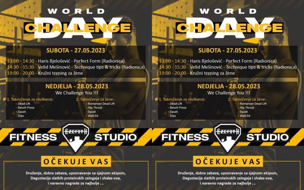 SVJETSKI DAN SPORTA U FITNESS STUDIU ZE-FIT -27.i 28.05.2023- Svjetski dan sporta nazvan je i Danom izazova (World Challenge day)