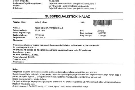 Đuli je prije osam mjeseci ustanovljen tumor kože i njena porodica je proteklih osam mjeseci pokušavala da pomogne i osigura neophodnu terapiju. Nakon jednog ciklusa kemoterapija doktor je predložio imunoterapiju. Nakon sedam doza imunoterapije Đula se osjeća bolje, ali cijena jedne doze je 1950 eura.