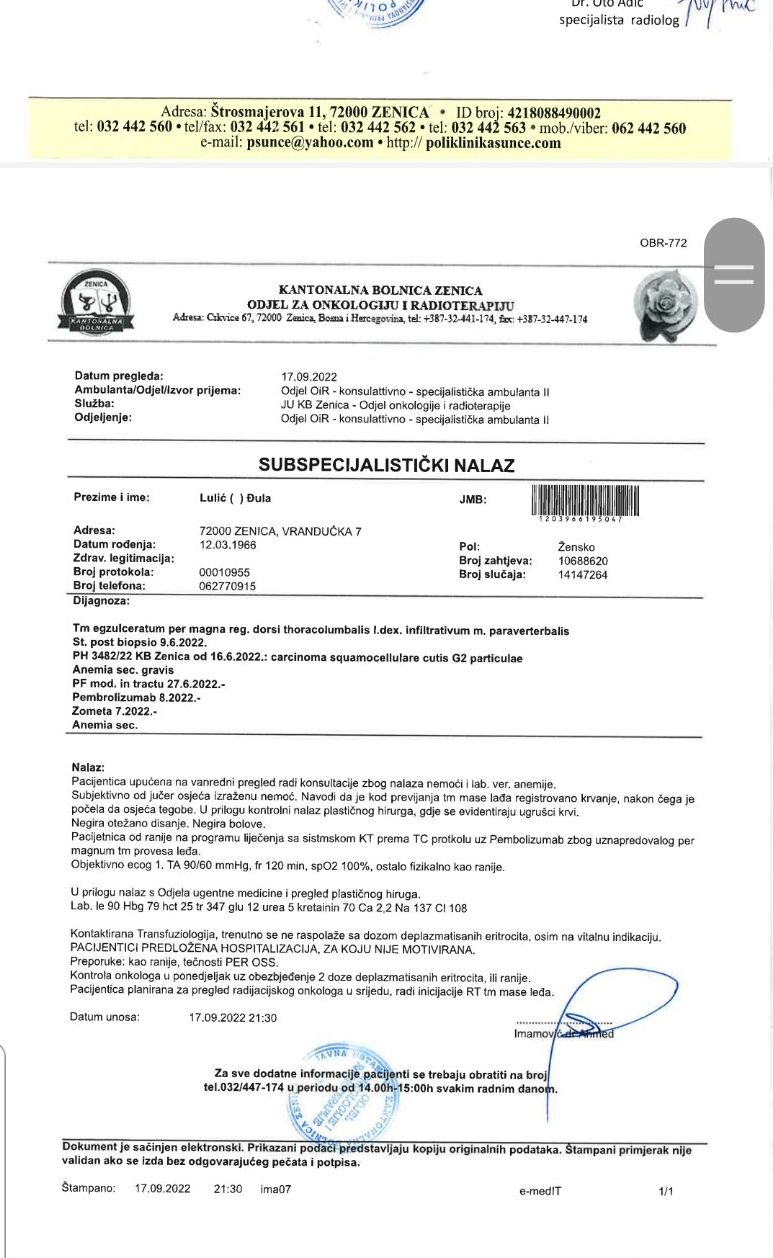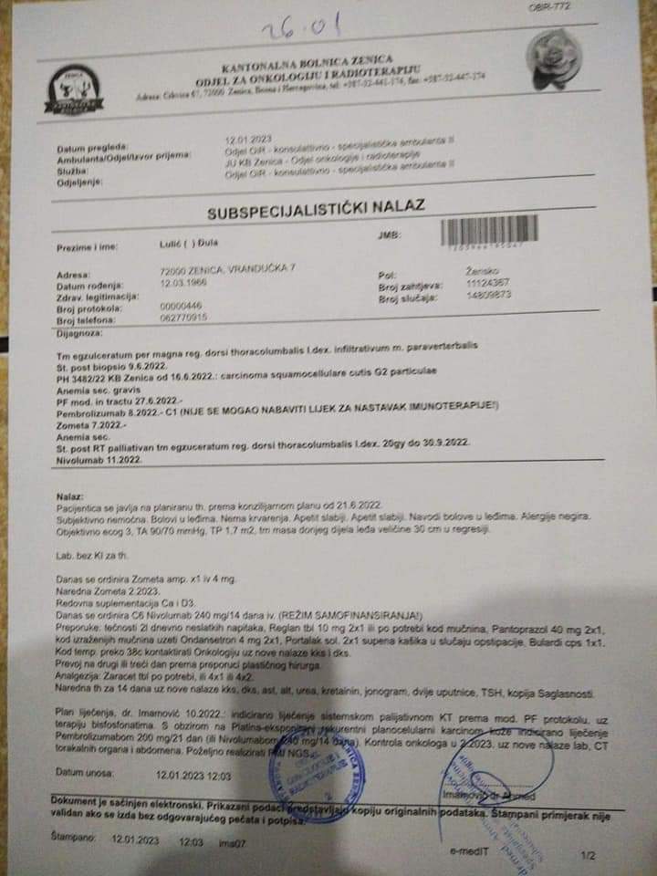 Đuli je prije osam mjeseci ustanovljen tumor kože i njena porodica je proteklih osam mjeseci pokušavala da pomogne i osigura neophodnu terapiju. Nakon jednog ciklusa kemoterapija doktor je predložio imunoterapiju. Nakon sedam doza imunoterapije Đula se osjeća bolje, ali cijena jedne doze je 1950 eura.