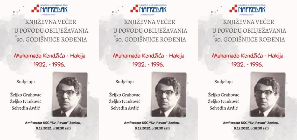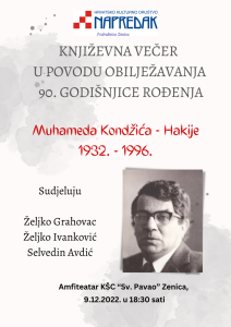 Hrvatsko kulturno društvo Napredak Zenica povodom 90. godišnjice rođenja istaknutog bosanskohercegovačkog književnika Muhameda Kondžića, organizira književnu večer njemu u čast.