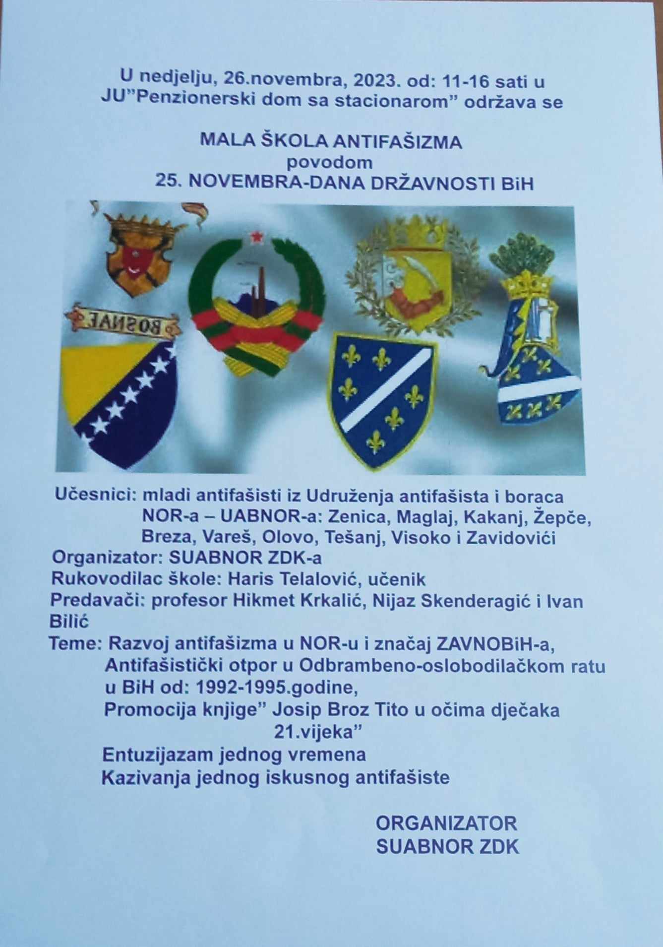 NAJAVA: Mala škola antifašizma u Zenici- U nedjelju 26. novembra od 11h do 16h u JU “Penzionerski dom sa stacionarom” ZDK održava se “MALA ŠKOLA ANTIFAŠIZMA” povodom 25. novembra Dana državnosti BiH.