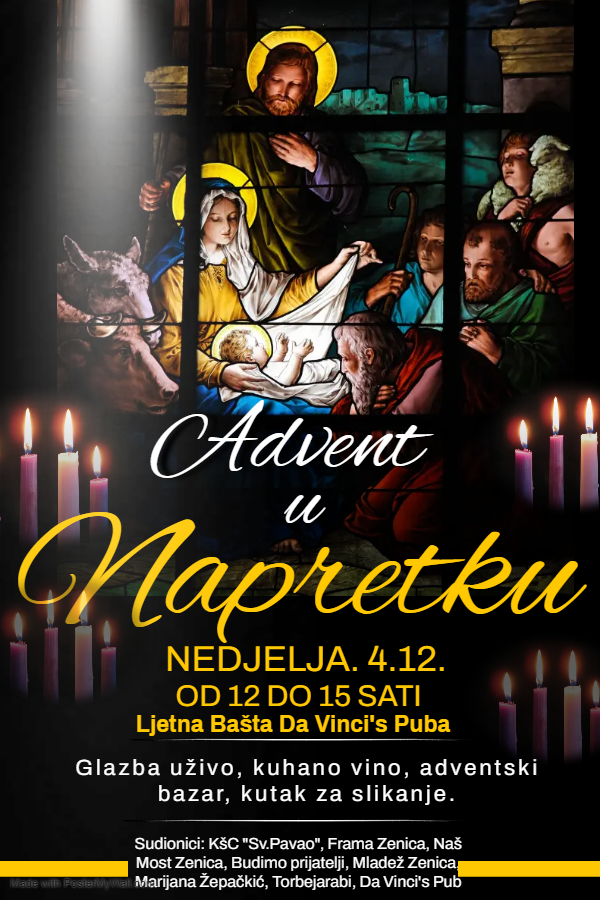 Poštovani sugrađani, hrvatsko kulturno društvo “Napredak” Zenica poziva Vas na druženje uz glazbu uživo, kuhano vino, kolače i adventski bazar.