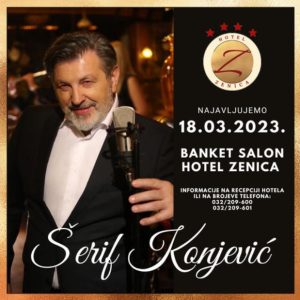 Imamo čast da najavimo gostovanje velike muzičke zvijezde, Šerifa Konjevića, koji će nastupiti 18.03.2023. godine u Banket salonu Hotela Zenica!
