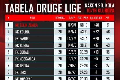 Pobjedom u posljednjem, 20.kolu, na gostovanju kod ekipe FK Borac u Jelahu od 1:3, zenički NK Čelik je zadržao prednost od pet bodova nad drugoplasiranom ekipom Koline u Drugoj ligi FBiH, grupa Centar.