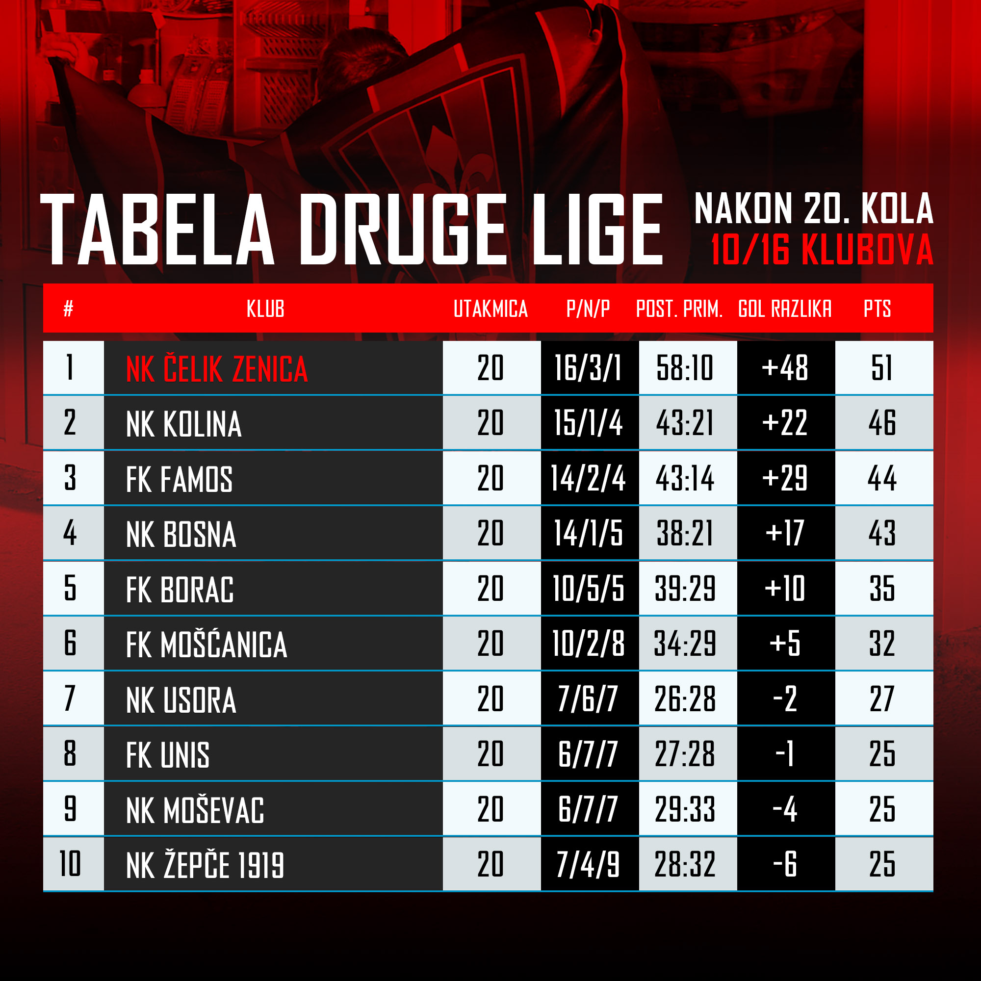 Pobjedom u posljednjem, 20.kolu, na gostovanju kod ekipe FK Borac u Jelahu od 1:3, zenički NK Čelik je zadržao prednost od pet bodova nad drugoplasiranom ekipom Koline u Drugoj ligi FBiH, grupa Centar.