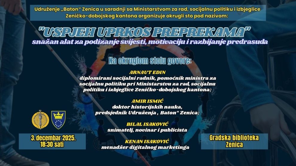 Povodom 3. decembara – Međunarodnog dana osoba s invaliditetom Udruženje „Baton“ Zenica u saradnji sa Ministarstvom za rad, socijalnu politiku i izbjeglice Zeničko-dobojskog kantona organizuje okrugli sto pod nazivom: