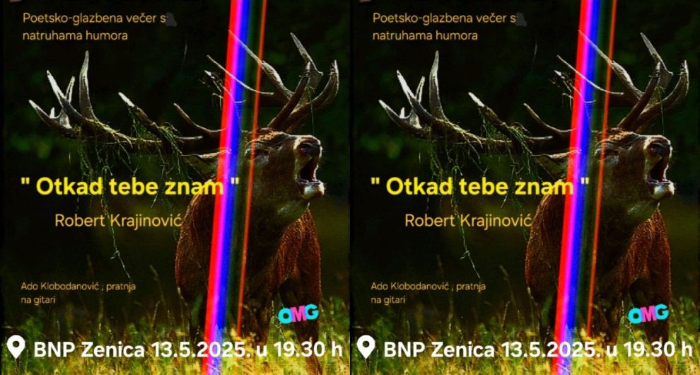 Zbog velikog interesovanja i na zahtjev publike, s radošću objavljujemo novi termin izvedbe. Poetsko-glezbena večer s natruhama humora “Otkad tebe znam” u izvedbi Roberta Krajinovića i uz pratnju Ade Klobodanovića na gitari, opet je sa Vama u utorak, 13. maja u 19.30 sati u Bosanskom narodnom pozorištu Zenica.