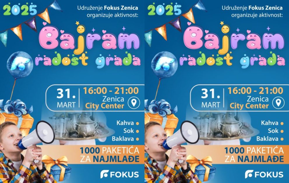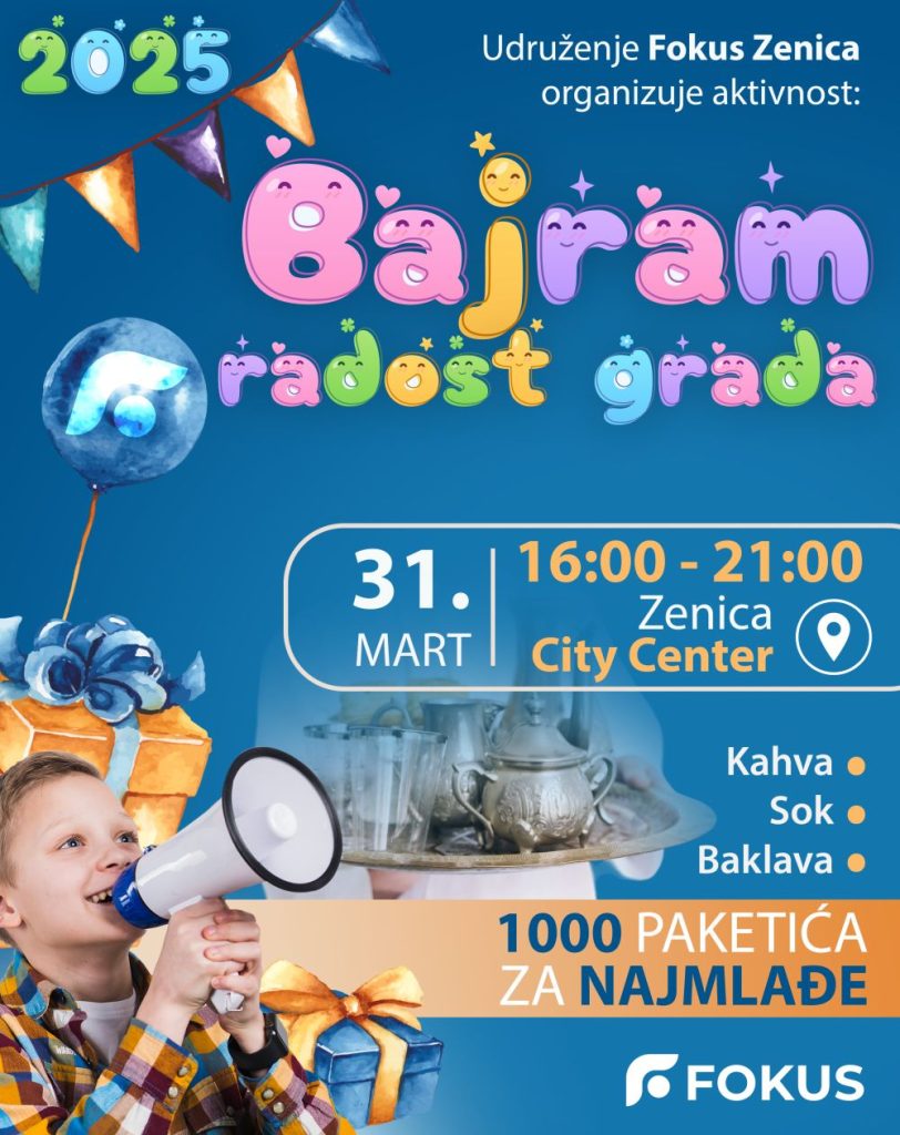 NAJAVA: Poziv na bajramsko okupljanje „Bajram – radost grada“ u Zenici- Udruženje Fokus s velikim zadovoljstvom poziva sve građane na tradicionalno bajramsko okupljanje pod nazivom „Bajram – radost grada“, koje će se održati 31. marta 2025. godine u Zenica City Centru, od 16:00 do 21:00. Ovaj događaj ima za cilj oživiti duh Bajrama u našem gradu, promovirajući zajedništvo, radost i pozitivnu atmosferu.