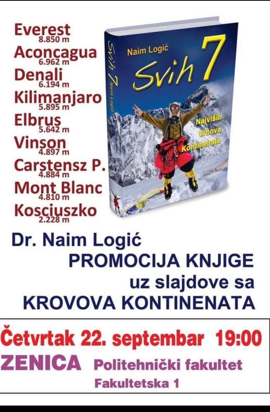 Doživljaje sa ovih uspona pretočio je u knjigu “Svih sedam”. Dr Logić danas živi u Feniksu u Sjedinjenim Američkim Državama i ukazao nam je čast promovisati svoju knjigu u Zenici, gdje nam dolazi nakon 2015. godine. Ovo je jedinstvena prilika da upoznamo lik i djelo ovog veoma uspješnog bosanskohercegovačkog planinara, koji je ostavio neizbrisiv trag u historiji našeg planinarstva.