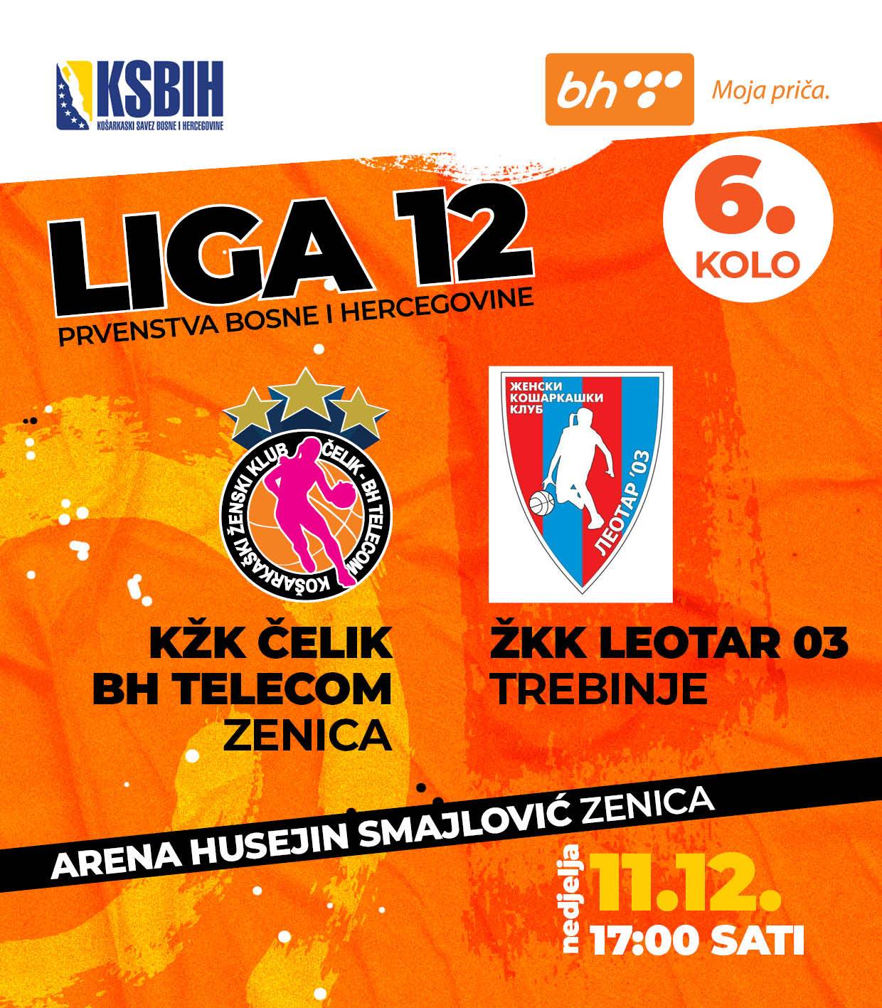 17 sati, Zenica: KŽK Čelik BH Telekom-ŽKK „Leotar 03“ (Liga 12 bh.košark. liga za žene-6..kolo-Arena);