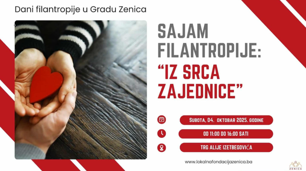 S tim u vezi, pozivamo Vas na Sajam filantropije: Iz srca zajednice, koji organizuje Lokalna fondacija Zenica, uz podršku Gradske uprave Grada Zenica, koji će se održati 04.10.2025. godine (subota) sa početkom od 11:00 – 16:00 sati na Trgu Alije Izetbegovića u Zenici.