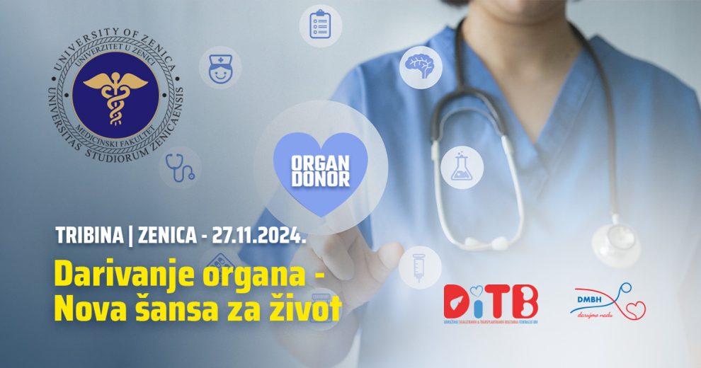 Tribina na temu donorstva i transplantacije u organizaciji Medicinskog fakulteta u Zenici , a u suradnji s Donorskom mrežom u BiH i Udruženjem/Udrugom dijaliziranih i transplantiranih bolesnika FBIH održat će se u srijedu, 27. 11. 2024. s početkom u 17,00 h u amfiteatru ovog fakulteta.