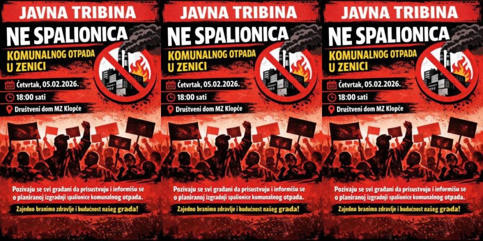 NAJAVA: U Klopču javna tribina “NE spalionici komunalnog otpada u Zenici”- U organizaciji Građanske inicijative „NE spalionici otpada u Zenici“ i Mjesne zajednice Klopče, u četvrtak, 5. februara, s početkom u 18.00 sati, u Društvenom domu u Klopču biće održana javna tribina pod nazivom „NE spalionici komunalnog otpada u Zenici“.
