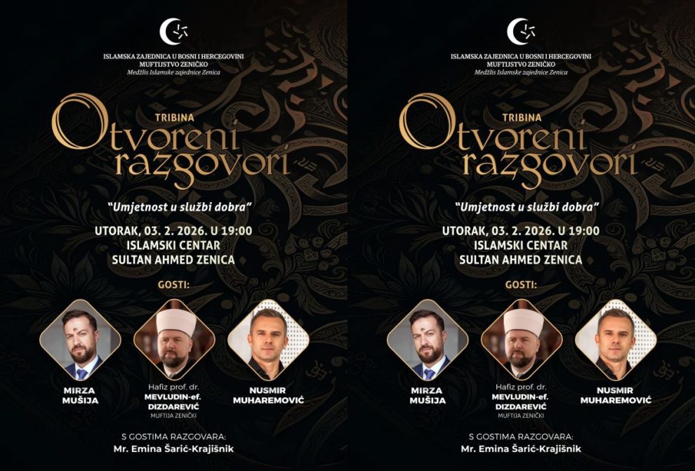 NAJAVA: U Zenici tribina „Otvoreni razgovori: Umjetnost u službi dobra“- Medžlis Islamske zajednice Zenica i Muftijstvo zeničko organizuju tribinu pod nazivom „Otvoreni razgovori: Umjetnost u službi dobra“, koja se realizira u okviru aktivnosti s ciljem otvaranja prostora za dijalog u promoviranju univerzalnih vrijednosti, društvene odgovornosti i općeg dobra.