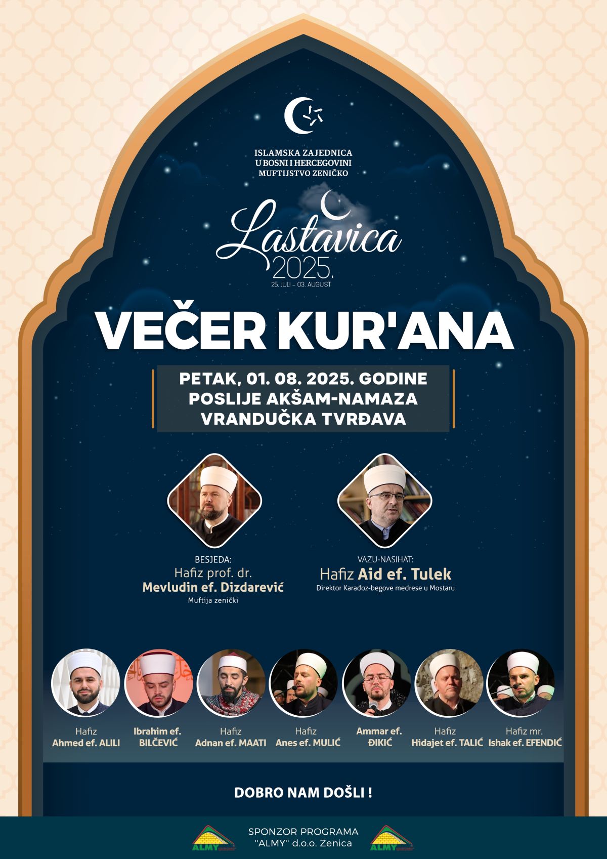 U sklopu programa vjersko-kulturne manifestacije ” Lastavica 2025.″, u petak, 01. augusta 2025. godine u Vrandučkoj tvrđavi održati će se ”Večer Kur’ana”.