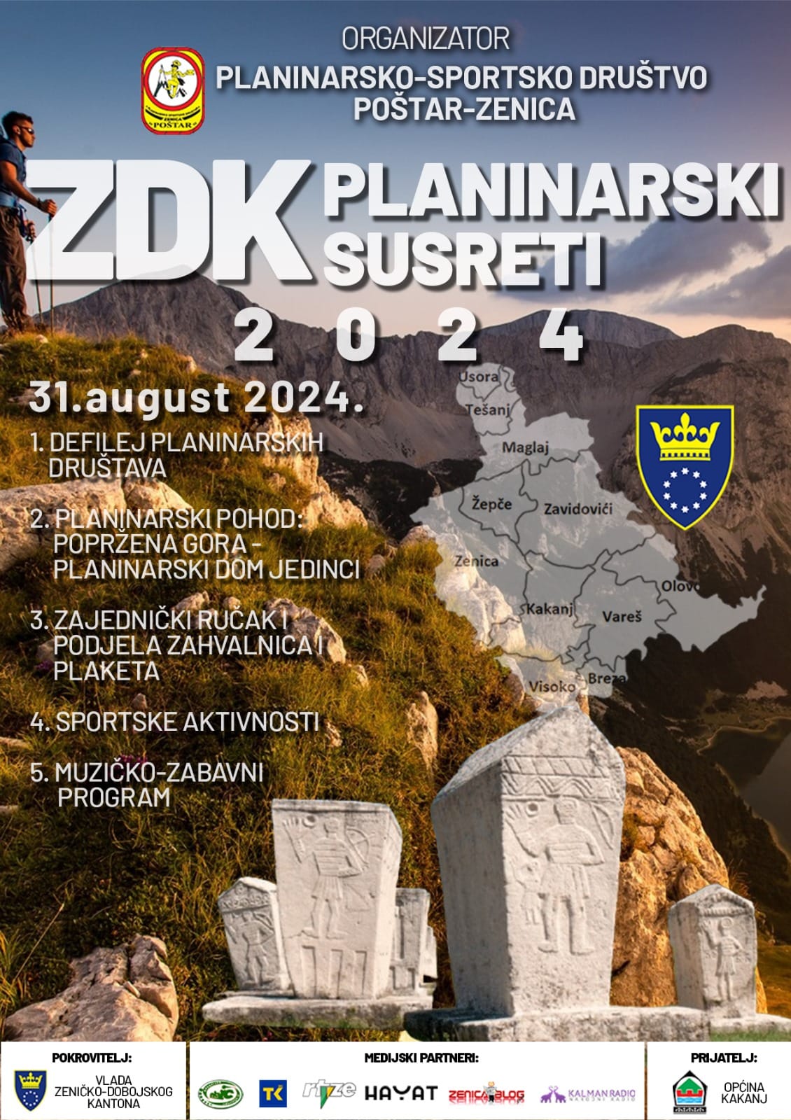 Planinarsko-sportsko društvo “Poštar” Zenica organizuje manifestaciju: “ZDK planinarski susreti 2024.“ koja će se održati 31.augusta 2024.godine (subota), a povodom Dana Zeničko-dobojskog kantona.