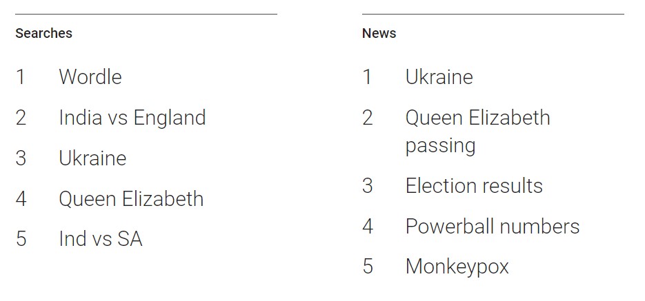 Ukrajina je također bila na vrhu godišnjeg popisa trendovskih tema vijesti. Smrt kraljice Elizabete bila je druga najpopularnija tema vijesti. Na trećem mjestu u sekciji vijesti u svijetu bili su rezultati izbora.