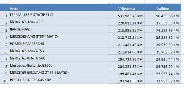 Na drugom mjestu liste najskupljih autmobila uvezenih u prva četiri mjeseca ove godine je Mercedes-AMG GTR vrijdan 220.813,21 KM, treći je jedan Range Rover 215.813,25.