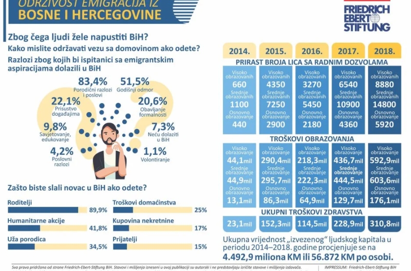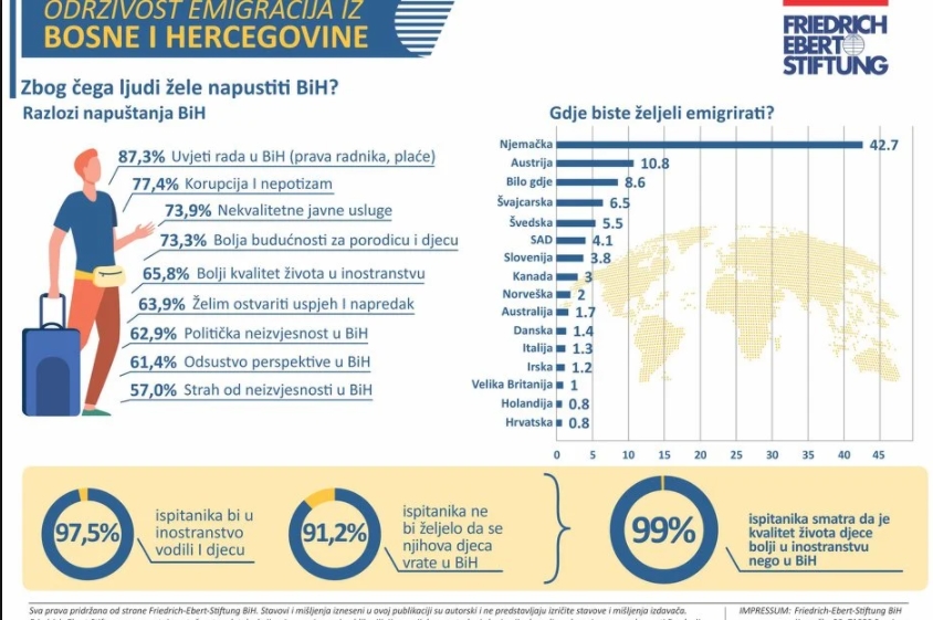 Najveći broj građana BiH želi iseliti zbog uslova rada, Njemačka za većinu prvi izbor – Njemačka Fondacija Friedrich Ebert je objavila publikaciju “Održivost emigracija iz Bosne i Hercegovine”, koja između ostalog sadrži podatke o razlozima iseljavanja stanovništva i u koje zemlje bi najradije otišli.