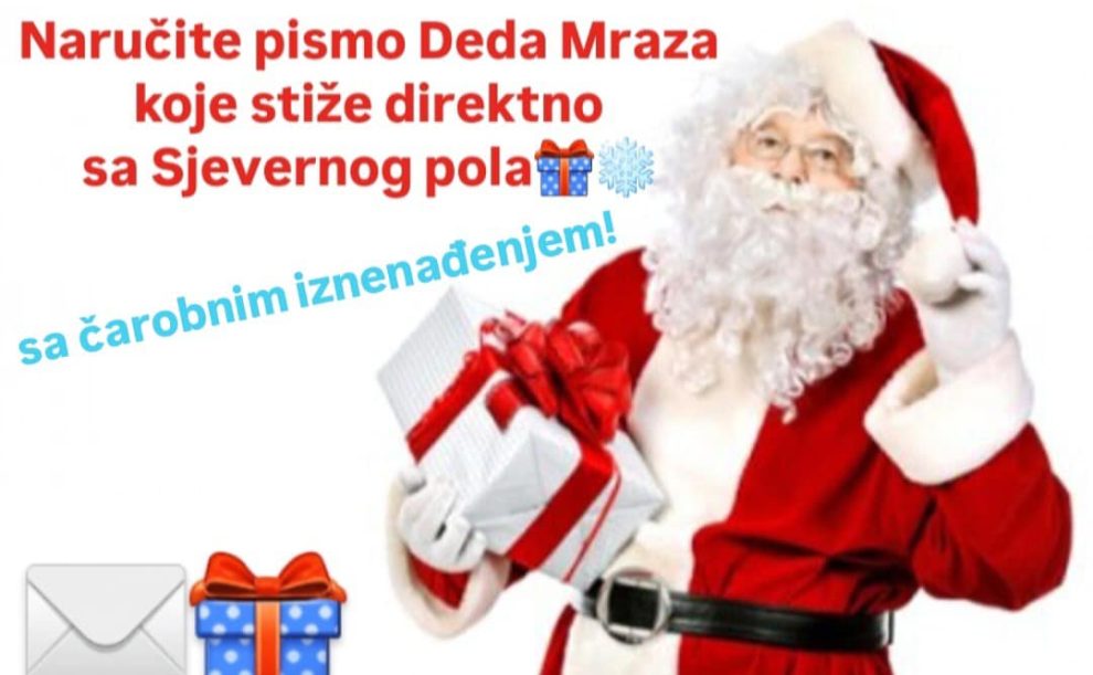 Drage mame i tetke, strine, tate, amidže, daidže, komšinice…ovo je vaša prilika da za svoje najdraže članove porodice i komšiluka (najmlađe) naručite specijalan poklon, jer Djeda Mrazova pomoćnica, Teta Čarobnica i Djeda Mraz za Vas imaju ČAROBNU prazničnu ponudu: PISMO SA SJEVERNOG POLA DIREKTNO IZ DJEDA MRAZOVE ČAROBNE RADIONICE