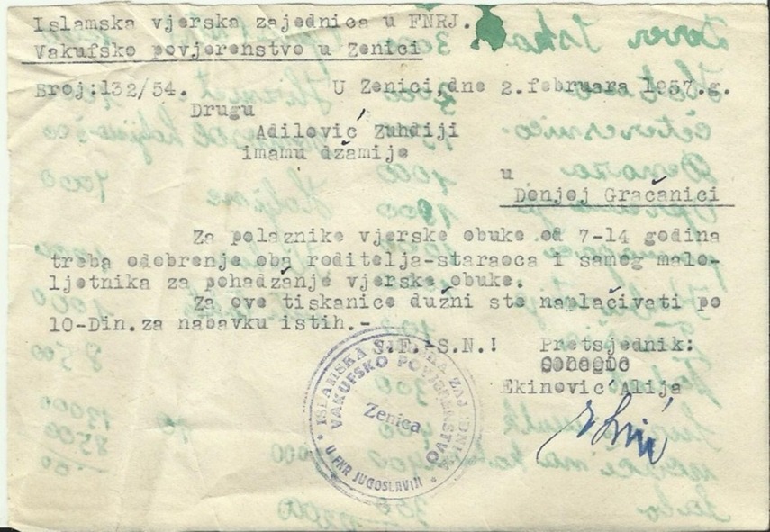 Maloljetna djeca su morala da potpisuju pismeni pristanak da idu u mekteb, uz prethodni pismeni pristanak oba roditelja (akt 132/54), a o tome se strogo vodila evidencija i to je kontrolisala tadašnja socijalistička vlast.