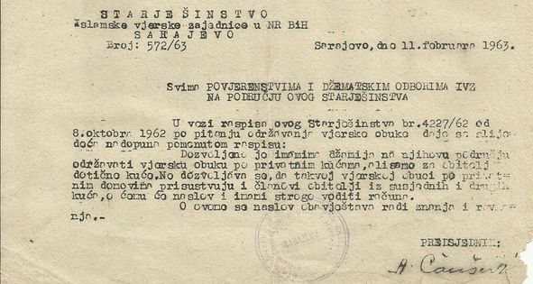 Dozvolili su pouku djece po kućama, ali samo za djecu iz te kuće, pa je upućen iz Starješinstva IVZ Sarajevo (akt broj 572/63 svim džematskim odborima od 11. februara 1963. godine), da se strogo vodi računa da takvoj vjerskoj pouci ne prisustvuju članovi obitelji iz susjednih kuća.