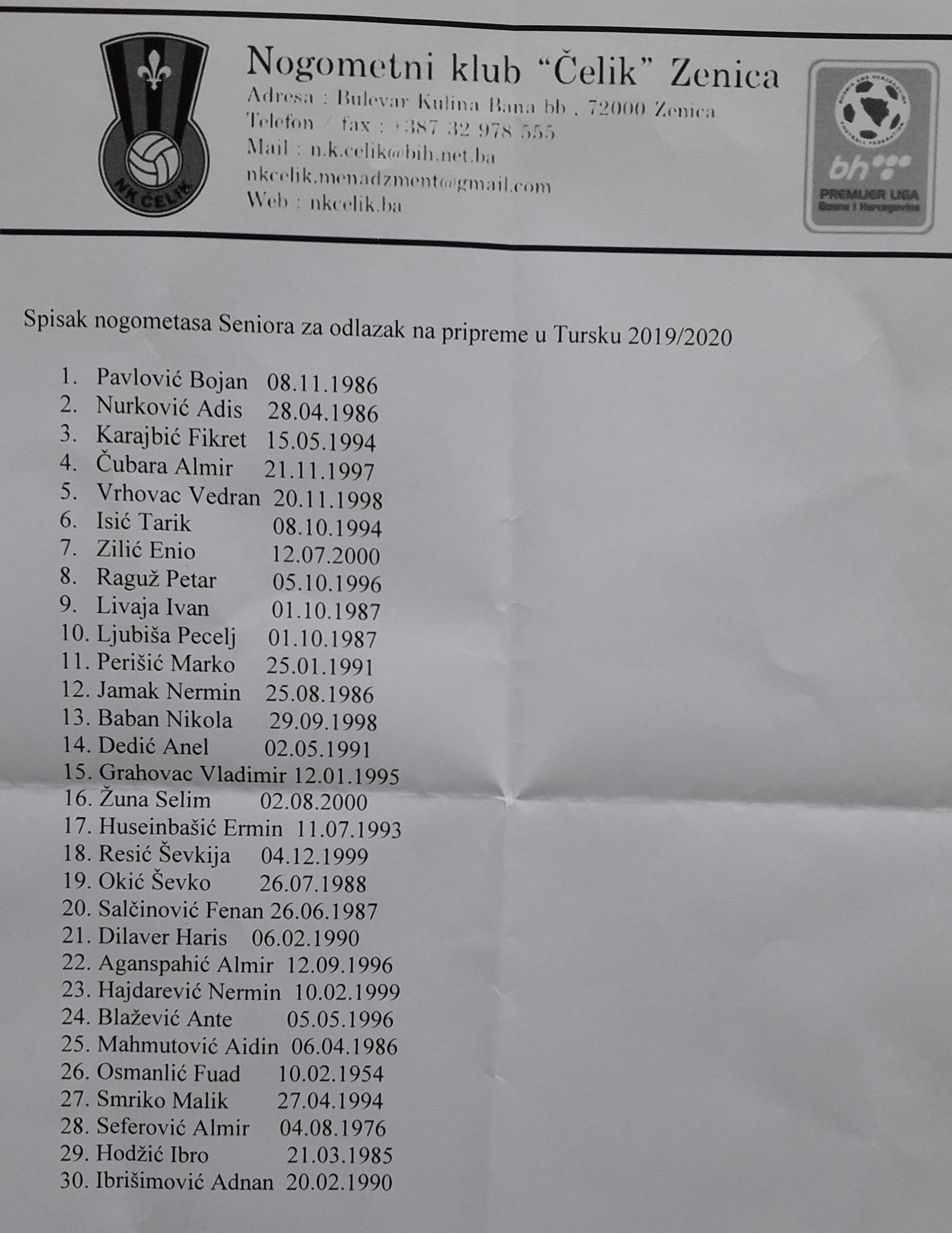 Nogometaši Čelika danas putuju na ljetne pripreme u Tursku Ispred stadiona Bilino polje, danas 25.6.2019.godine, na pripreme u Tursku okupila se ekspedicija prvog tima NK Čelik sa 30 putnika na spisku, koji smo dobili od generalnog sekretara NK Čelik, Ismara Huskića.