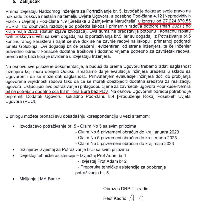 No, to nije ni konačan iznos kojeg će Cengiz Insaat dodatno naplatiti. U dokumentu koji potpisuje šef projekta ove dionice Reuf Kadrić, a koji je također u posjedu Fokusa, navodi se da suma od 27,2 miliona eura ne predstavlja potpunu isplatu svih troškova.