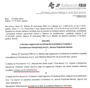 – Prihvatanjem evaluacije inžinjera doći će do probijanja ugovorene vrijednosti radova tako što će se morati obezbijediti dodatna sredstva za realizaciju ugovora, uključujući ovo potraživanje i prilagodbu cijene za završetak ugovora Poprikuše – Nemila bit će potrebno dodatno cca 83 miliona eura bez PDV-a. Na osnovu ugovornih odredbi, potrebno je pripremiti dodatak ugovoru – stoji u aktu Autocesta FBiH.