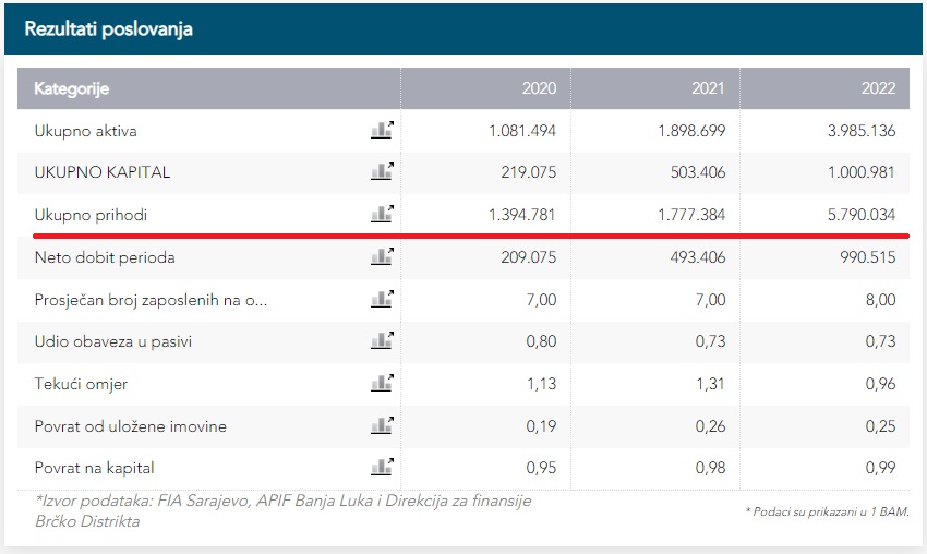 Kada je riječ o firmi Meganet, prema zvaničnim finansijskim podacima koje vodi bonitetna kuća Dun & Broadstreet, ukupni prihodi ove firme u proteklim godinama rapidno su rasli. U 2020. godini iznosili su 1,3 miliona KM, u 2021. godini 1,7 miliona, da bi se u 2022. godini popeli na čak 5,7 miliona KM! Srazmjerno tome je rastao kapital, kao i neto dobit.