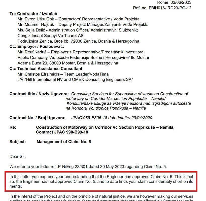 U njemu, između ostalog, Orsini u oštrijem tonu demantira Upravu Cengiza da je inžinjer IRD-a odobrio bilo kakvo povećanje troškova dionice, pri čemu naglašava da izvođač radova (Cengiz) nije u skladu s propisima niti odgovarajućim dokazima i dokumentacijom potkrijepio svoje zahtjeve o povećanju troškova.