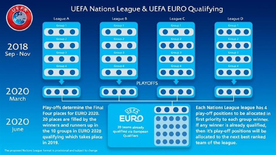 Ipak, novina je Liga nacija. To je novo UEFA-ino takmičenje koje će biti podijeljeno u četiri lige, a svaka liga bit će podijeljena na četiri jakosne skupine koje će imati po tri ili četiri reprezentacije.