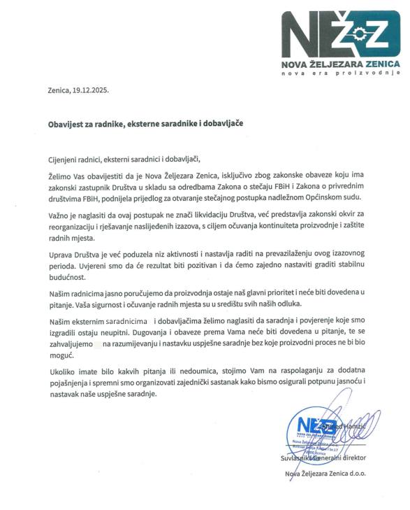 Nova Željezara Zenica obavijestila je danas svoje radnike, vanjske saradnike, partnere i dobavljače da je, zbog zakonske obaveze, podnijela prijedlog za otvaranje stečajnog postupka nadležnom Općinskom sudu.