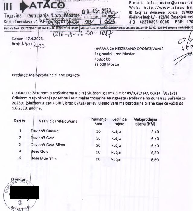 Upravi za indirektno oporezivanje Bosne i Hercegovine stigla je obavijest o novim maloprodajnim cijenama koje će važiti od 1. juna, a obavijest je uputio Ataco.