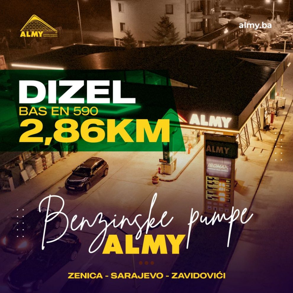 Obavještavamo naše cijenjene kupce da je nova cijena goriva DIZEL, na benzinskim pumpama ALMY u Zenici, Sarajevu i Zavidovićima, 2,86KM/L.