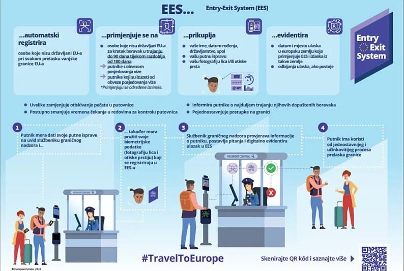 “EES je sistem Europske unije za digitalnu registraciju podataka o ulasku i izlasku državljana trećih zemalja, kao i podataka o odbijenim ulascima na vanjskim granicama država članica. Ovaj sistem, definisan je Uredbom (EU) 2017/2226, koja zamjenjuje ručno štambiljanje putnih isprava automatiziranim postupkom bilježenja podataka”, navodi se iz MUP-a RH.