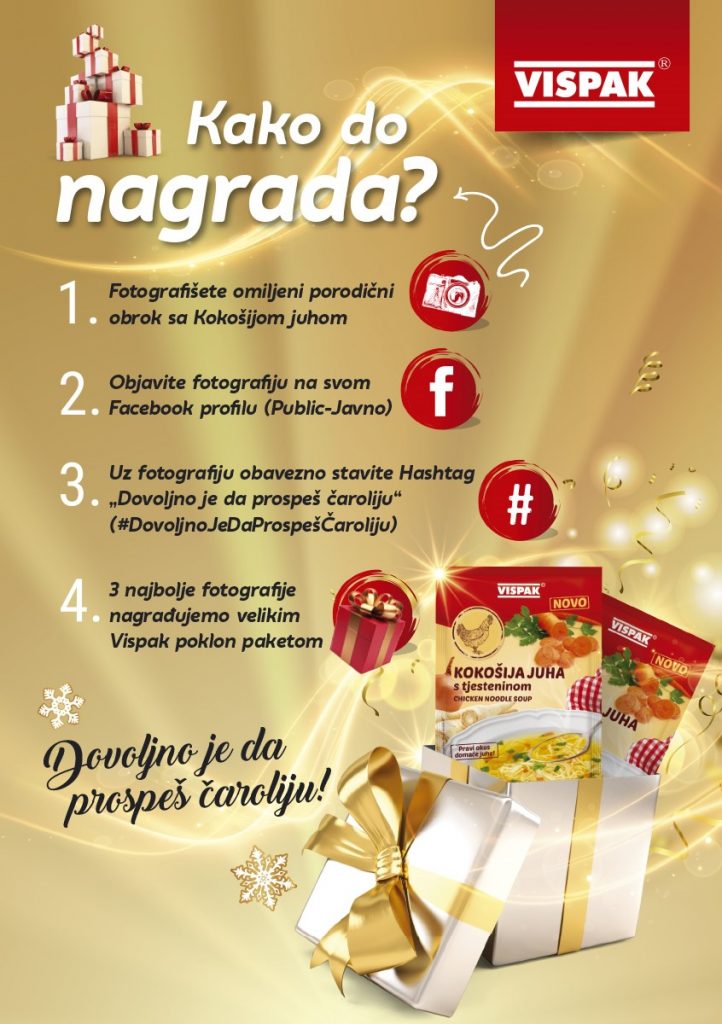 Istodobno, svi potrošači Kokošije juhe Vispak moći će učestvovati u Facebook nagradnoj kampanji „Dovoljno je da prospeš čaroliju“ gdje će omiljeni porodični obrok sa Kokošijom juhom fotografisati, objaviti fotografiju na lični Facebook profil i staviti oznaku „Dovoljno je da prospeš čaroliju“ (#DovoljnoJeDaProspešČaroliju). Na taj način će steći uvjet za učešće u kampanji i ući u izbor za najbolje 3 fotografije. Na Vispakovom Facebook profilu 3. januara 2018. će biti objavljene 3 najbolje fotografije i kreatori tih fotografija, koji osvajaju odlične Vispak poklon pakete.