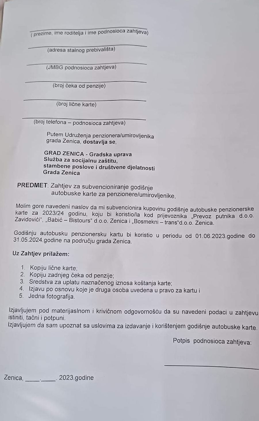 Obavještavamo članove, korisnike godišnjih autobuskih karata na području grada Zenica, da je danas 07.06.2023.godine, dogovoren prijevoz penzionera za 2023/24 godinu.
