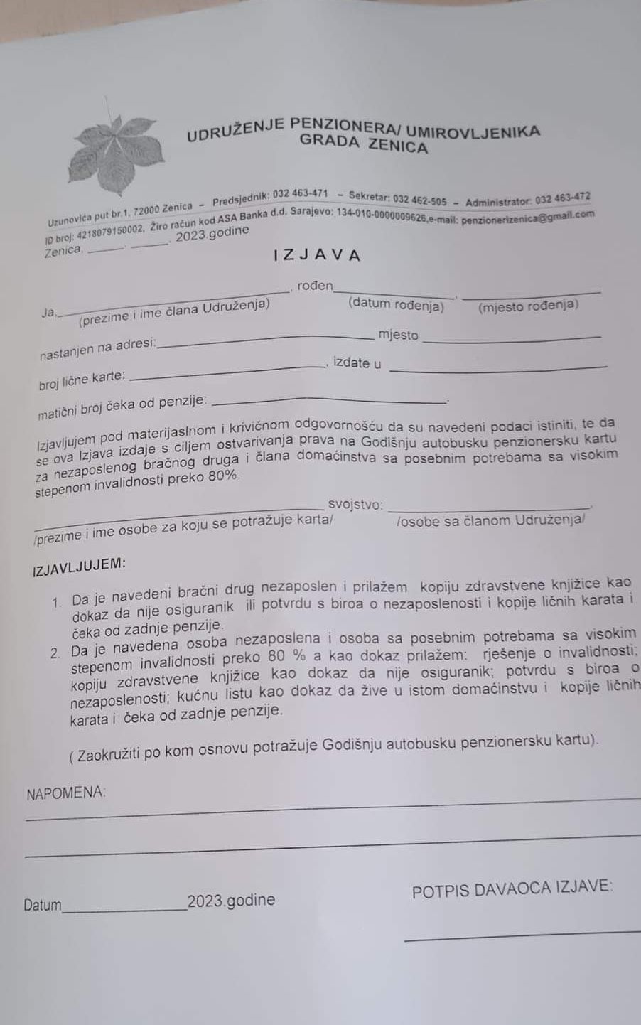 Cijena godišnje autobuske penzionerske karte za 2023/24 godinu iznosi 132,oo KM a upis po Mjesnim podružnicama će početi 08.06.2023.godine i trajat će 7 dana a poslije toga roka, Služba će vršiti upis za pojedinačne Zahtjeve, do 01.07.2023.godine.Zahrjevi za kartu se mogu dobiti kod predsjednika Mjesnih podružnica i u Službi Udruženja.
