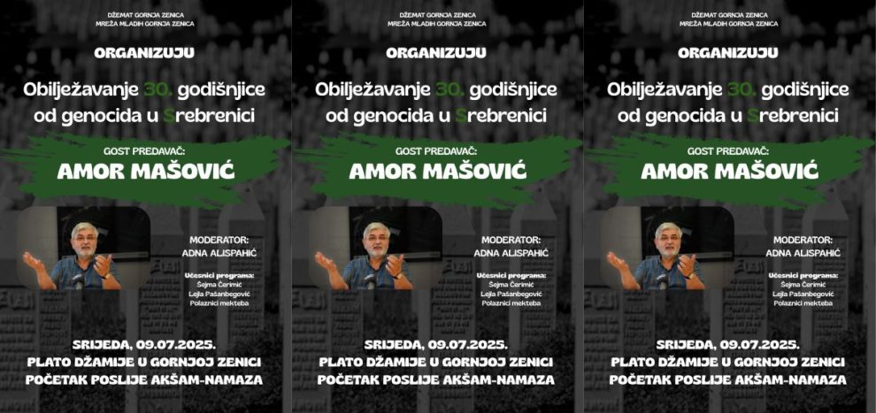 Program će biti održan na platou ispred džamije u Gornjoj Zenici, odmah nakon akšam-namaza, a glavni gost i predavač bit će uvaženi Amor Mašović – istraživač ratnih zločina, nekadašnji predsjedavajući Komisije za traženje nestalih osoba u BiH i dugogodišnji svjedok istine o srebreničkom genocidu.