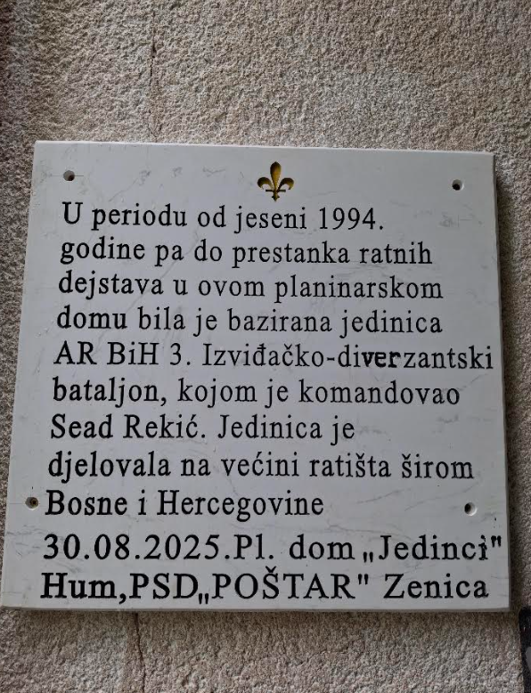 Pripremili smo i postavili kamenu ploču na zid planinarskog doma sa tekstom u kojem se navodi da je jedinica Armije RBiH 3.diverzantski bataljon kojom je komandovao Sead Rekić bila tokom rata stacionirana na domu “Jedinci”.