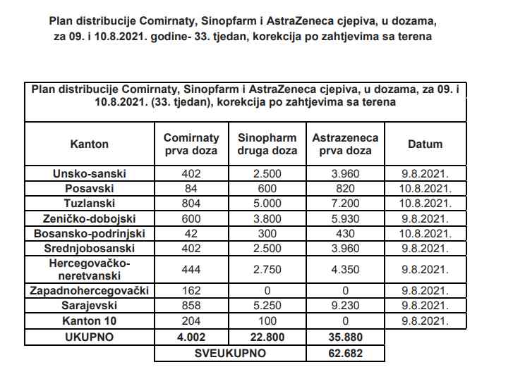 Tuzlanski kanton će 10. augusta dobiti 804 Comirnaty vakcine, 5.000 Sinopharm i 7.200 AstraZeneca. Sarajevski kanton će dobiti 858 Comirnaty doza, 5.250 Sinopharm i 9.230 doza AstraZeneca.