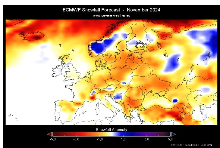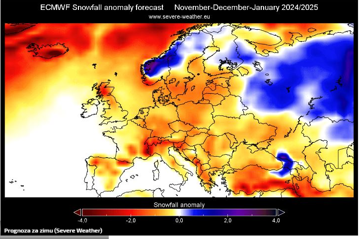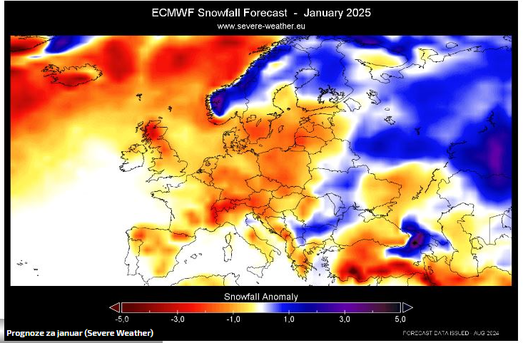 Prema najnovijim prognozama, i to oba modela, očekuje se da će zima 2024./2025. donijeti manje količine snijega u velikom dijelu Evrope u poređenju s prosječnim sezonama.