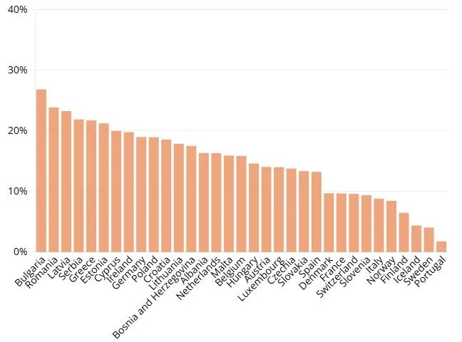 Ostale zemlje bivše Jugoslavije nisu obuhvaćene Eurostatovim izvještajem. Iz šireg okruženja je Albanija odmah iza Bosne i Hercegovine, na 14. mjestu, sa 16,35 posto. Njemačka kao najveća evropska ekonomija i jedna od najvećih ekonomija u svijetu je na devetom mjestu s 18,98 posto.