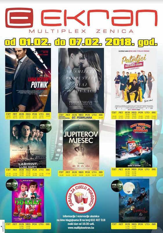 Od 01. februara u Multiplexu Ekran ne propustite pogledati uzbudljivi napeti triler sa Liamom Nessonom u glavnoj ulozi “PUTNIK”, dramu o sirijskom izbjeglici “JUPITEROV MJESEC”, a za najmlađe smo pripremili animiranu i sinhronizovanu avanturu “MALI VESELJAK – BROD SPASILAC”