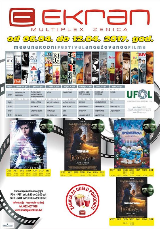 Od četvrka 6. aprila u Multiplexu Ekran Zenica prvi međunarodni festival angažovanog filma “UFOL” Zenica – Velika nam je čast poželjeti vam dobrodošlicu na prvi bosanskohercegovački međunarodni festival angažovanog filma – UFOL u okviru 22. MKM ZENIČKO PROLJEĆE.